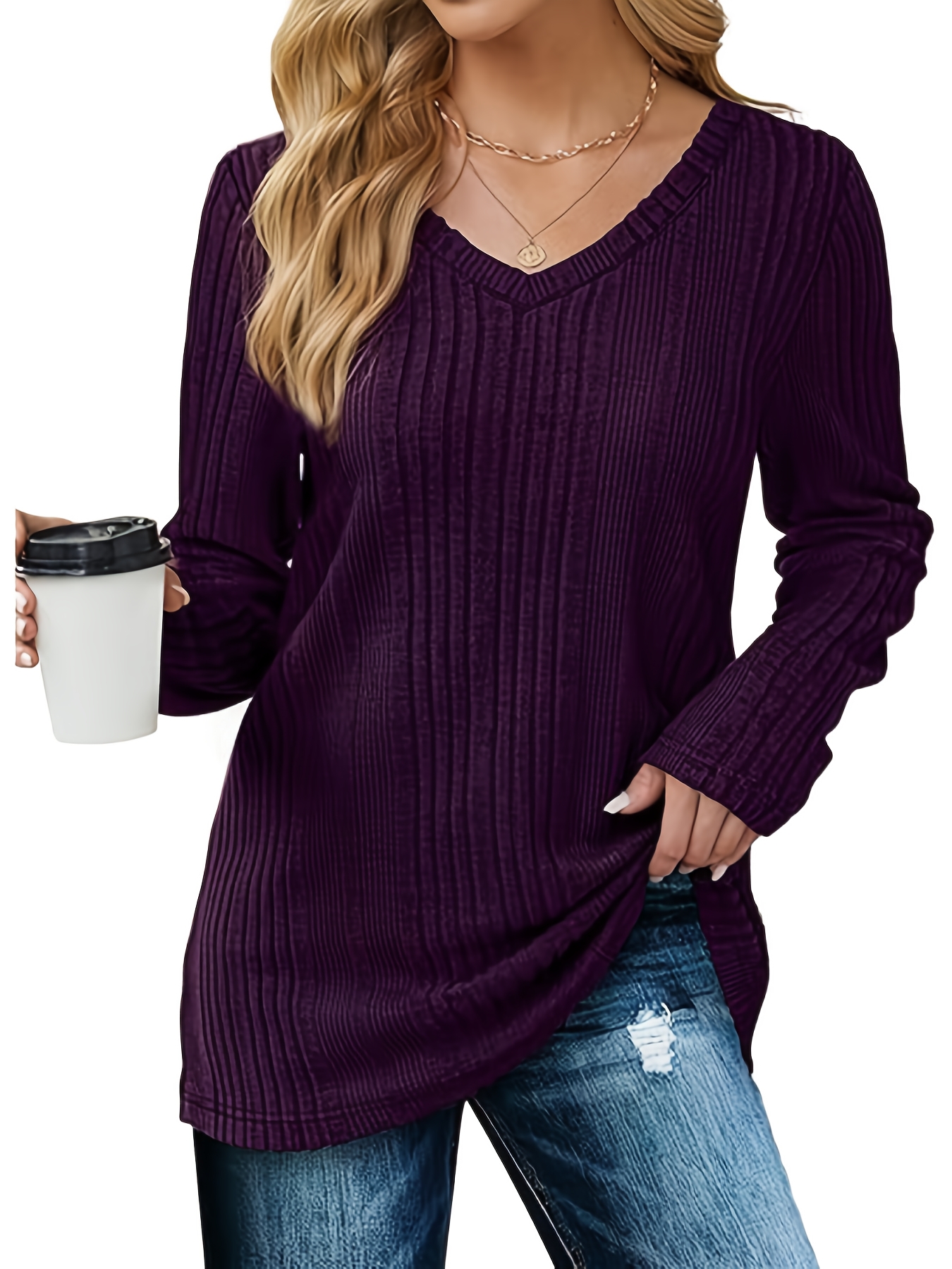 Women's Casual V-Neck Sweater - Solid Color, Ribbed Long Sleeve Knit Pullover, Machine Washable