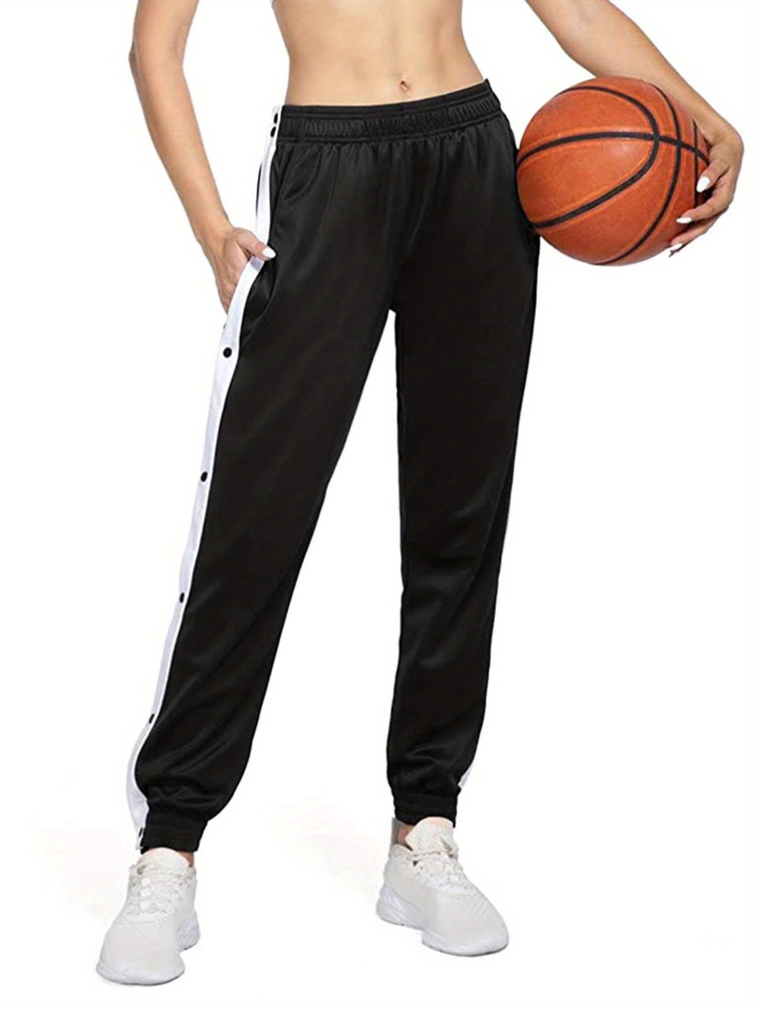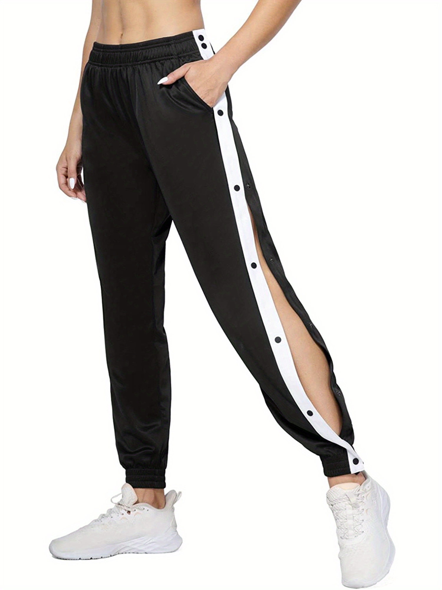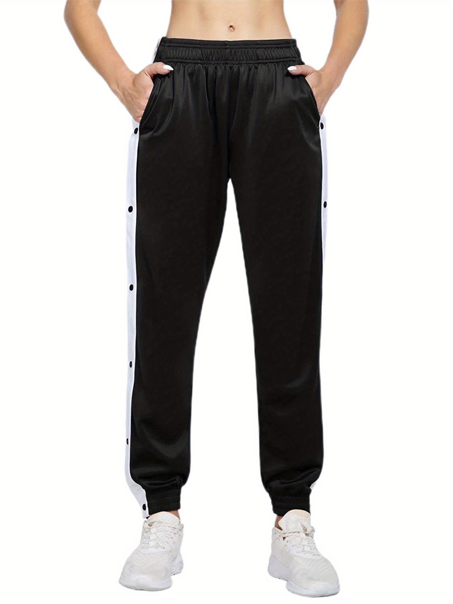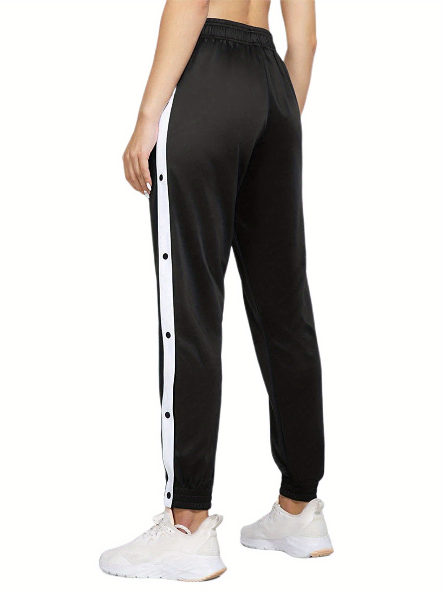 Women's High-Waist Joggers with Side Split - Casual Color Block, Buttoned Detail, Polyester, All-Season Fitness Pants