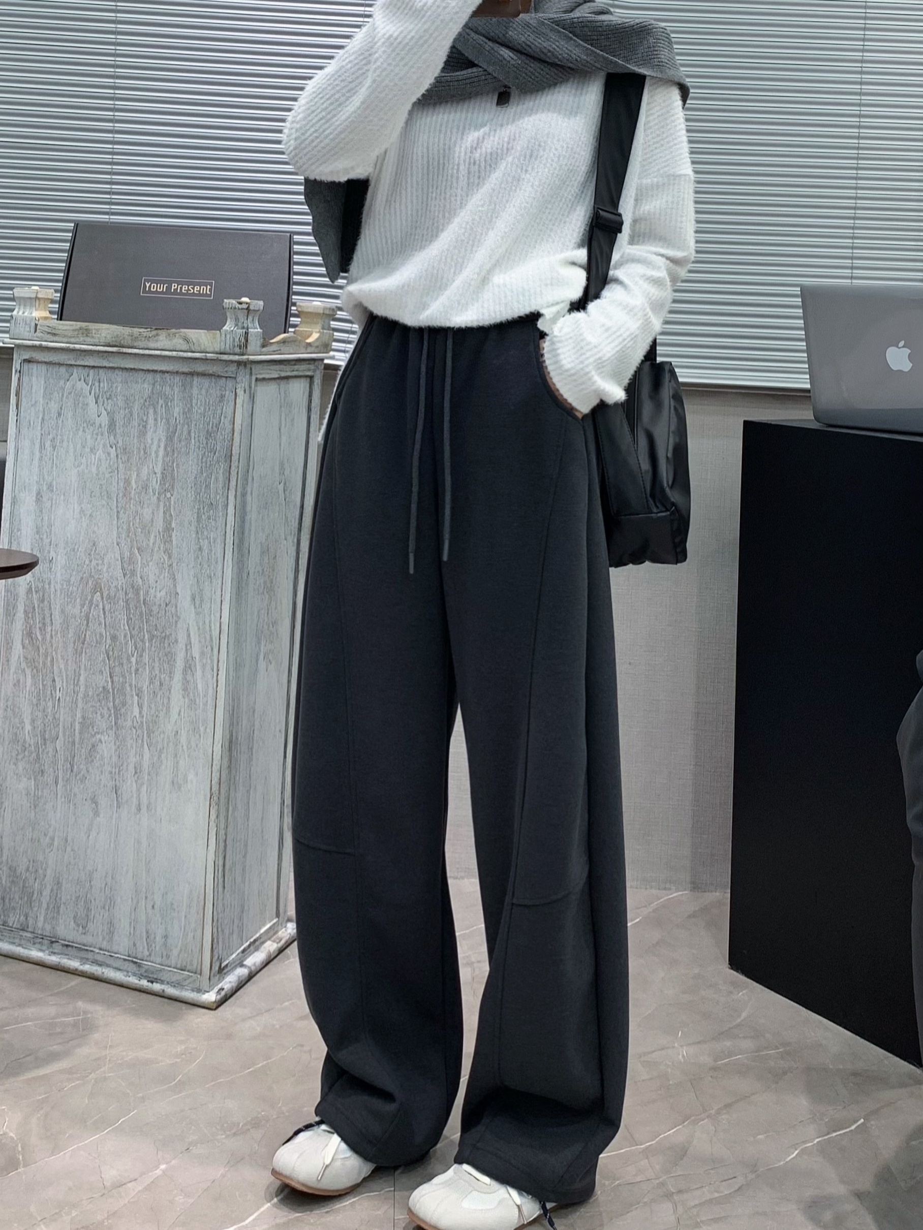 Women'S Casual Polyester Wide Leg Joggers, Loose Fit Knit Fabric Sweatpants, Solid Color, Long Length, with Shearling Lining, Elastic Waist with Drawstring, for Fall/Winter - Weekend Casual Style