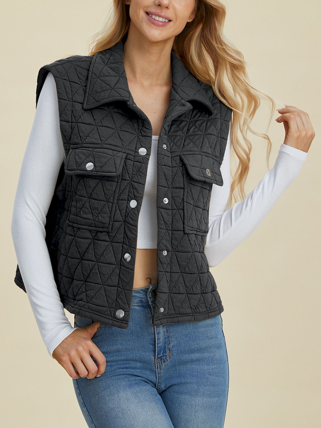 Women’s Casual Vest Coat Basic Quilted Pocketed Texture Snap Down Vest Navy Black Sleeveless Snap-Button Relaxed Fit Collared Cropped Outerwear with Diamond Pattern Spring/ Fall/ Winter Layering Piece for Outdoor Activities