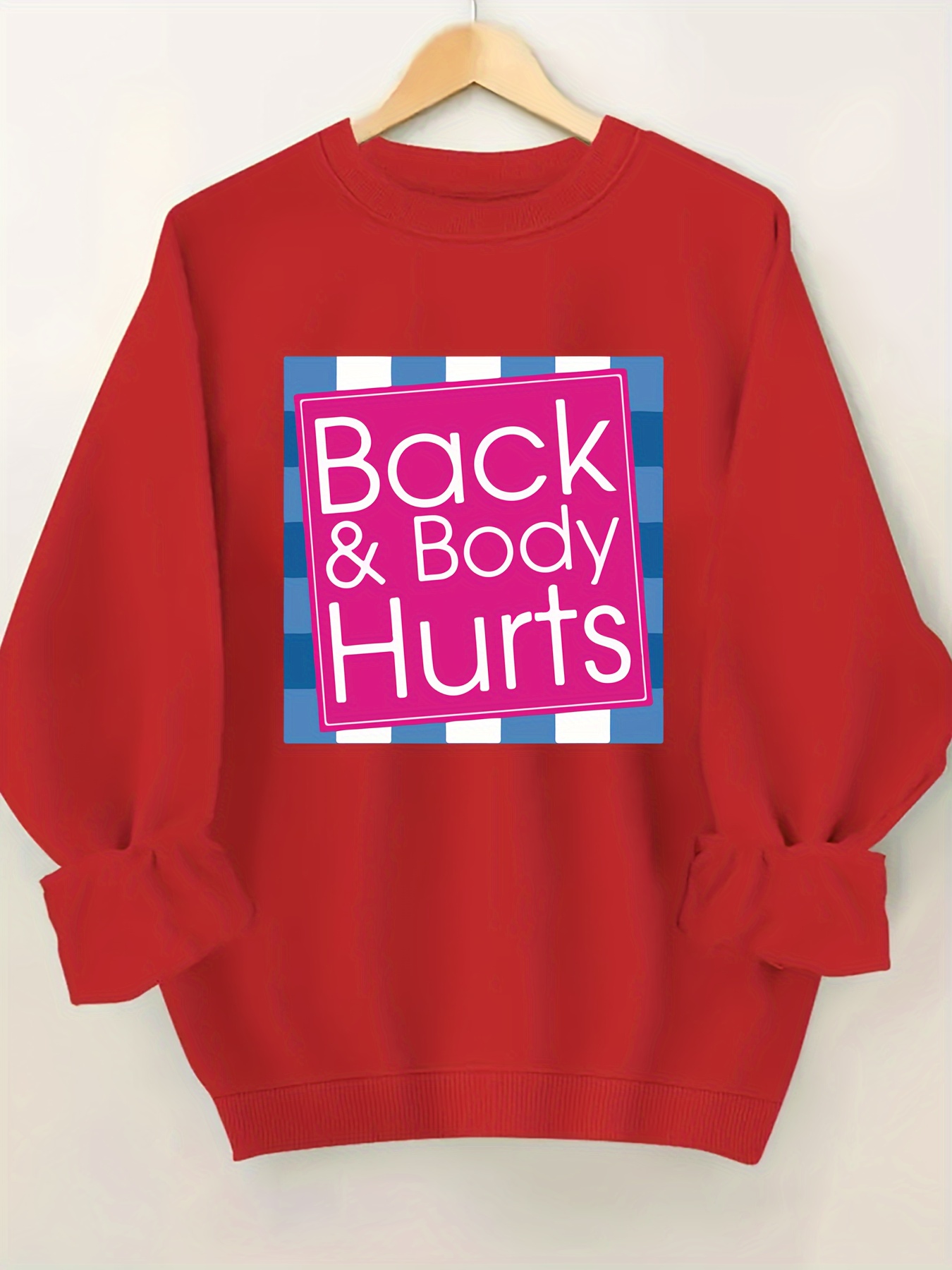 Plus Size Cozy Back & Body Hurts Print Pullover Sweatshirt - Soft, Casual, Long Sleeve Crew Neck Design for Fall & Spring - Women's Comfortable Plus Size Clothing for Everyday Wear