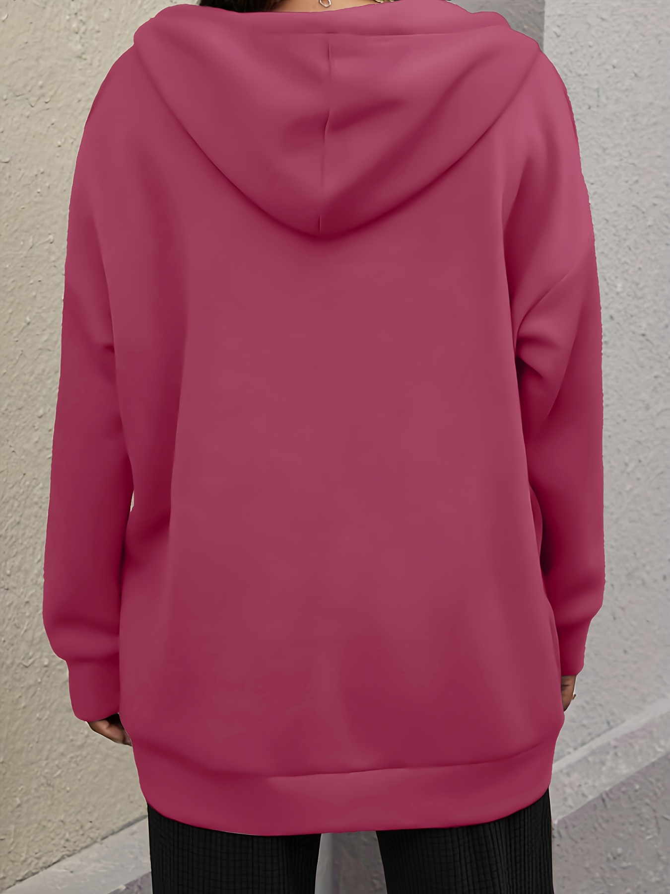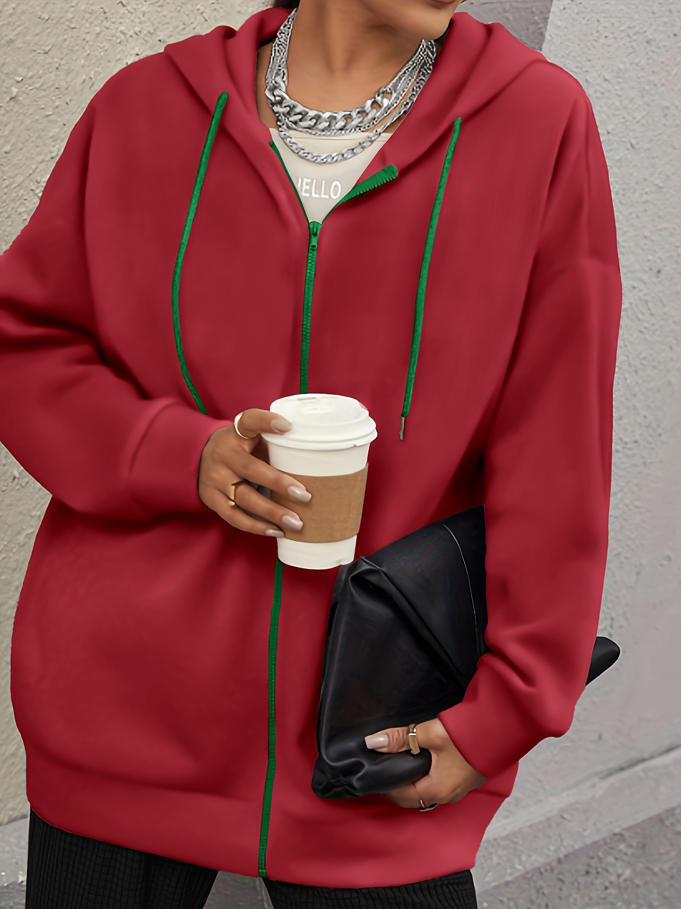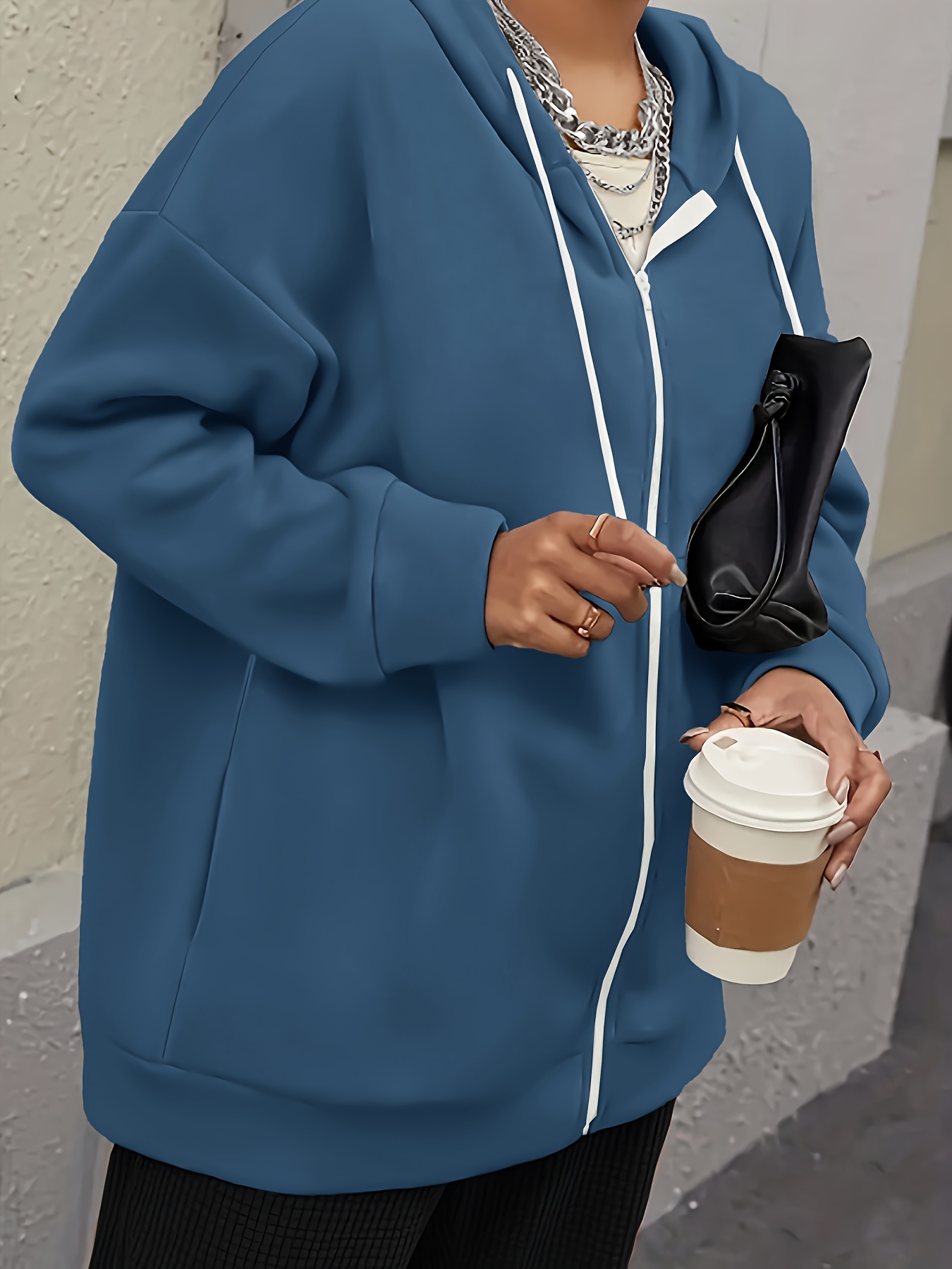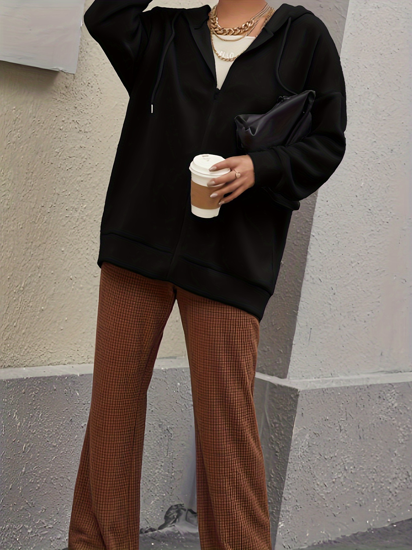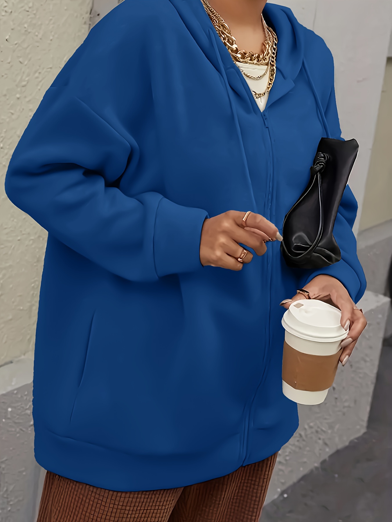 Plus Size Solid Color Zip Front Hoodie, Simple Casual Drawstring Long Sleeve Hooded Sweatshirt, Women's Plus Size Clothing
