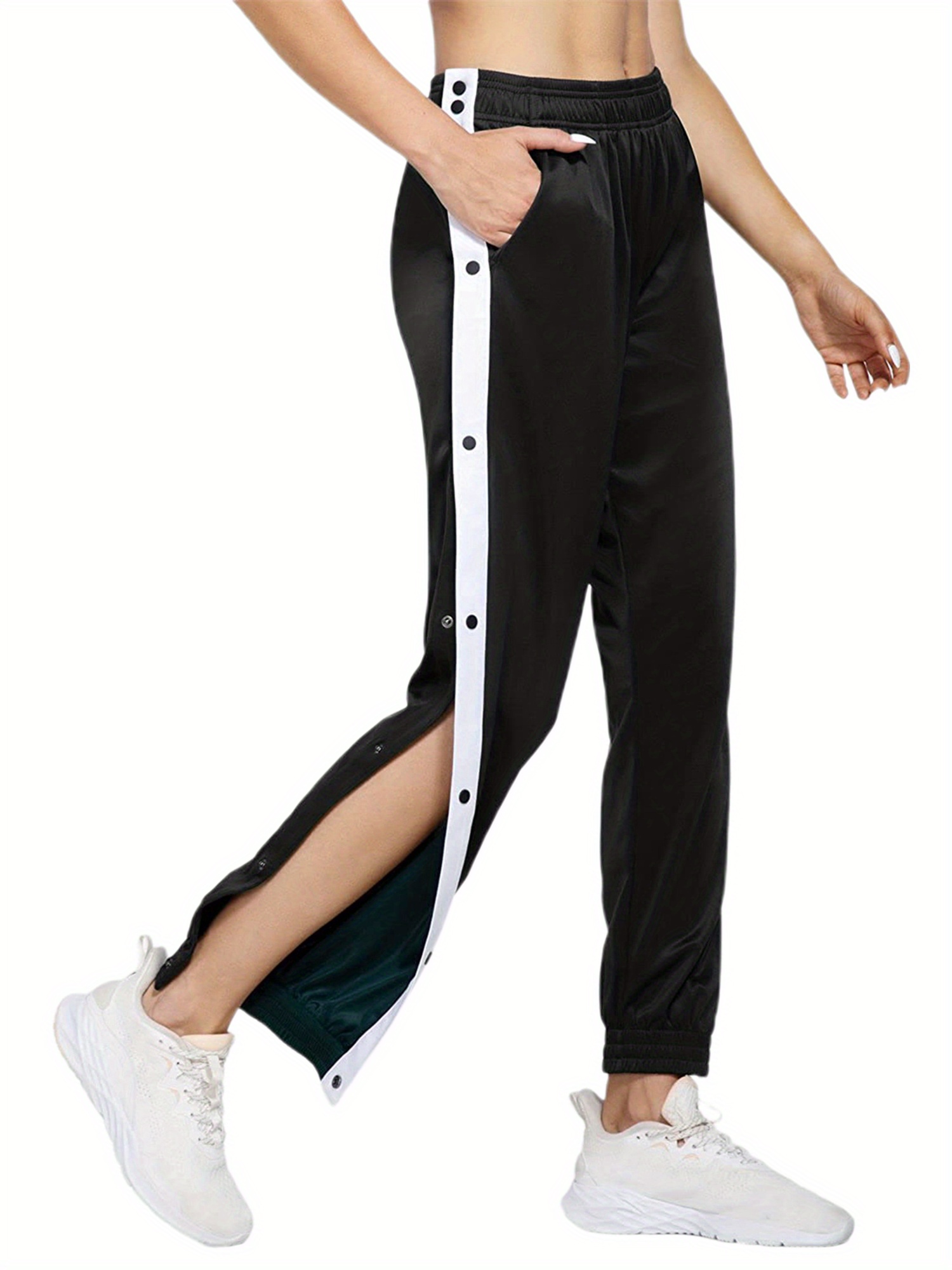 Women's High-Waist Joggers with Side Split - Casual Color Block, Buttoned Detail, Polyester, All-Season Fitness Pants
