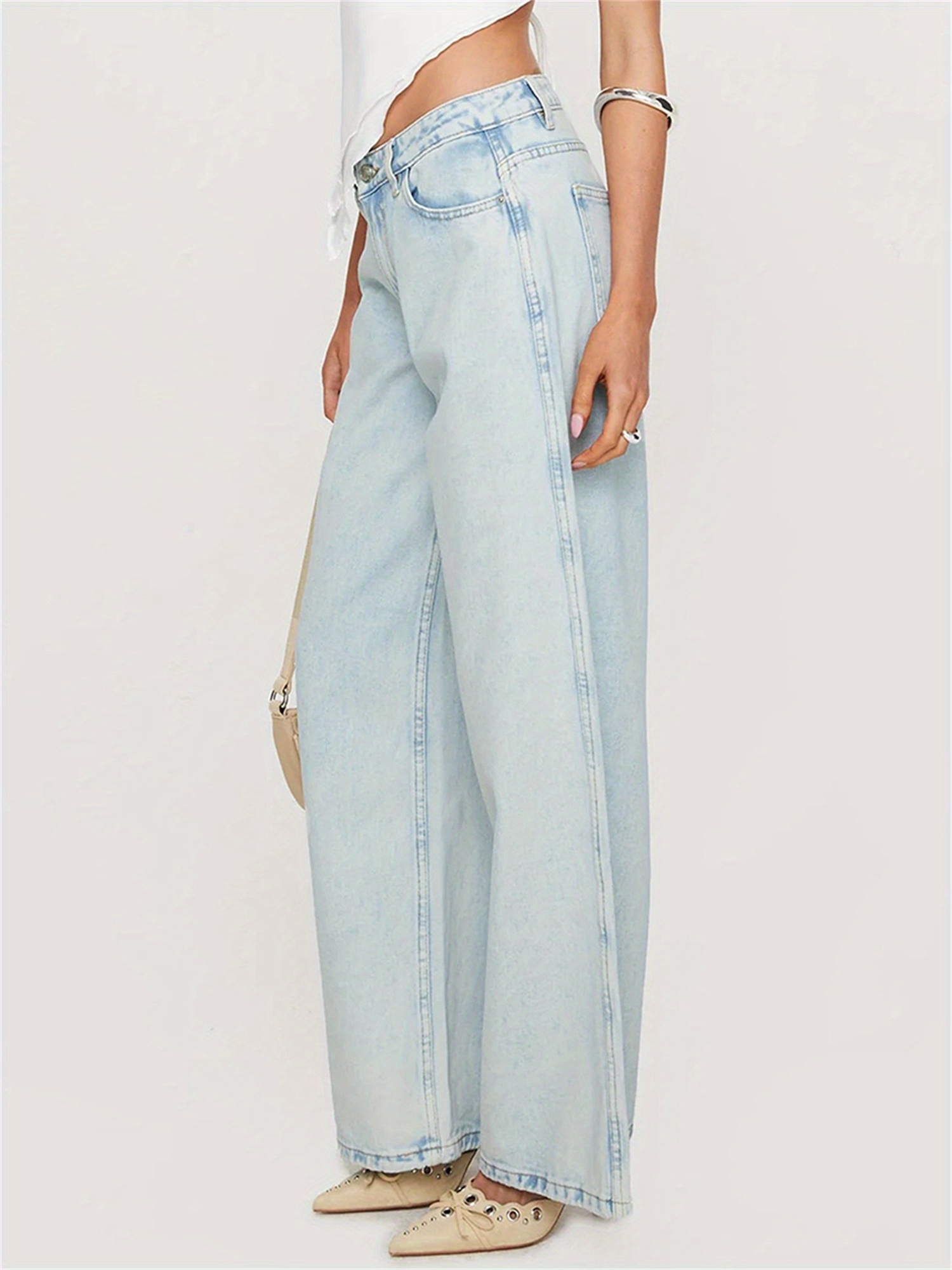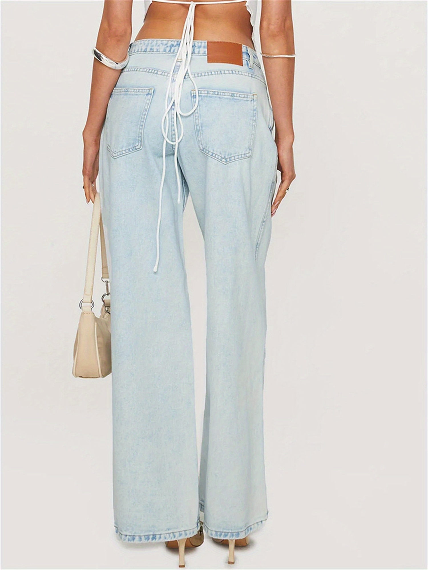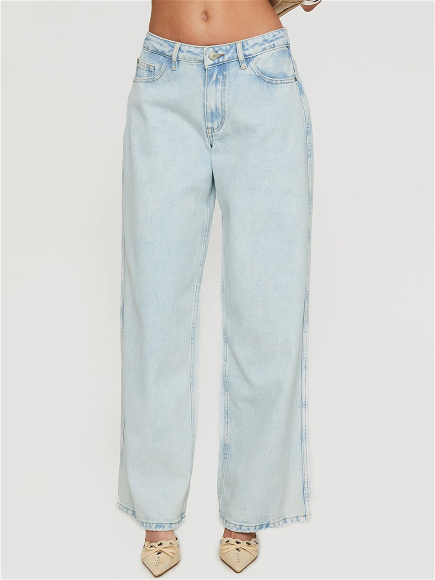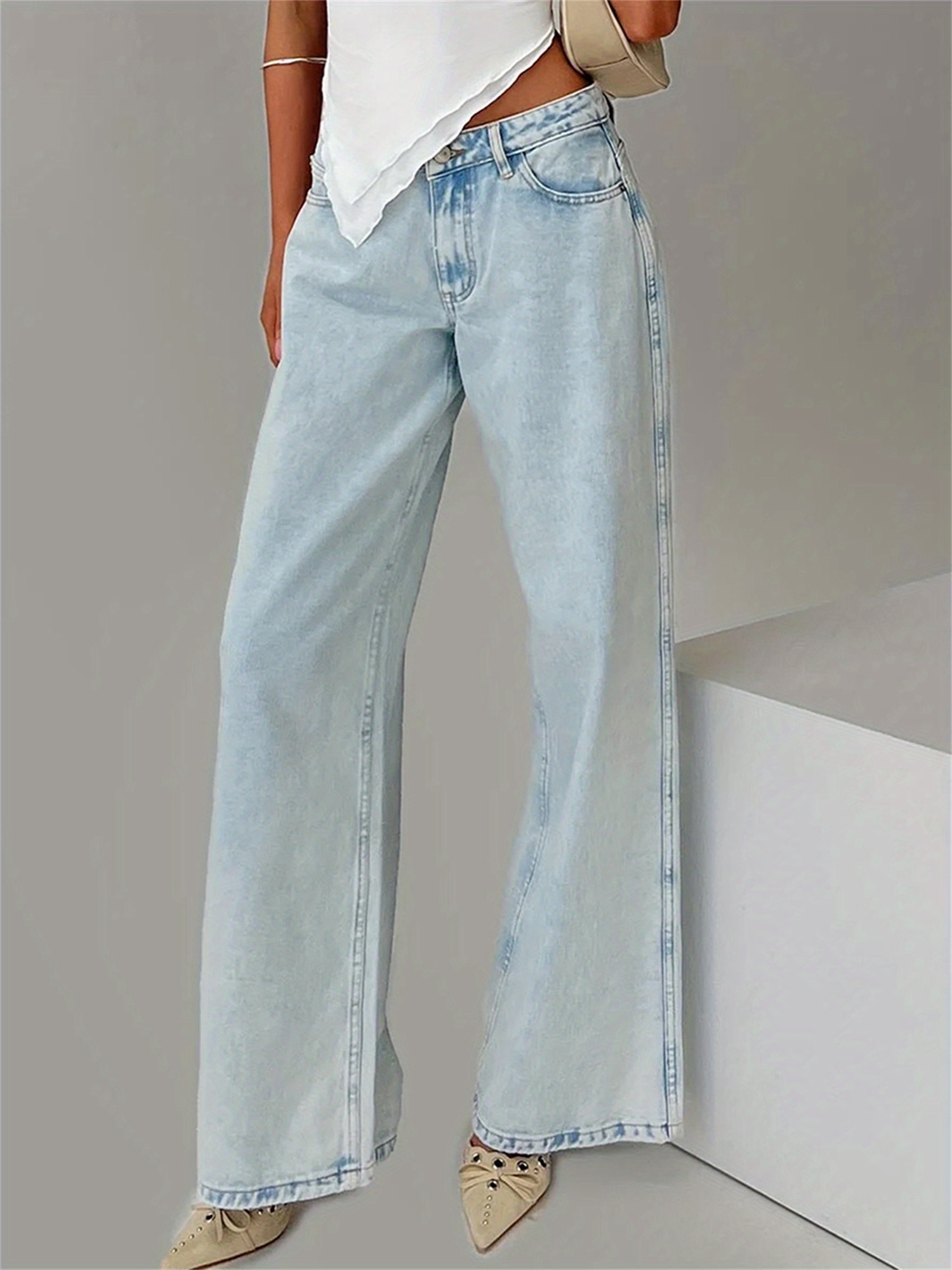 1pc Women'S Casual Cotton Wide Leg Jeans - Solid Color Low Waist Loose Fit with Pockets for Spring/Fall Season