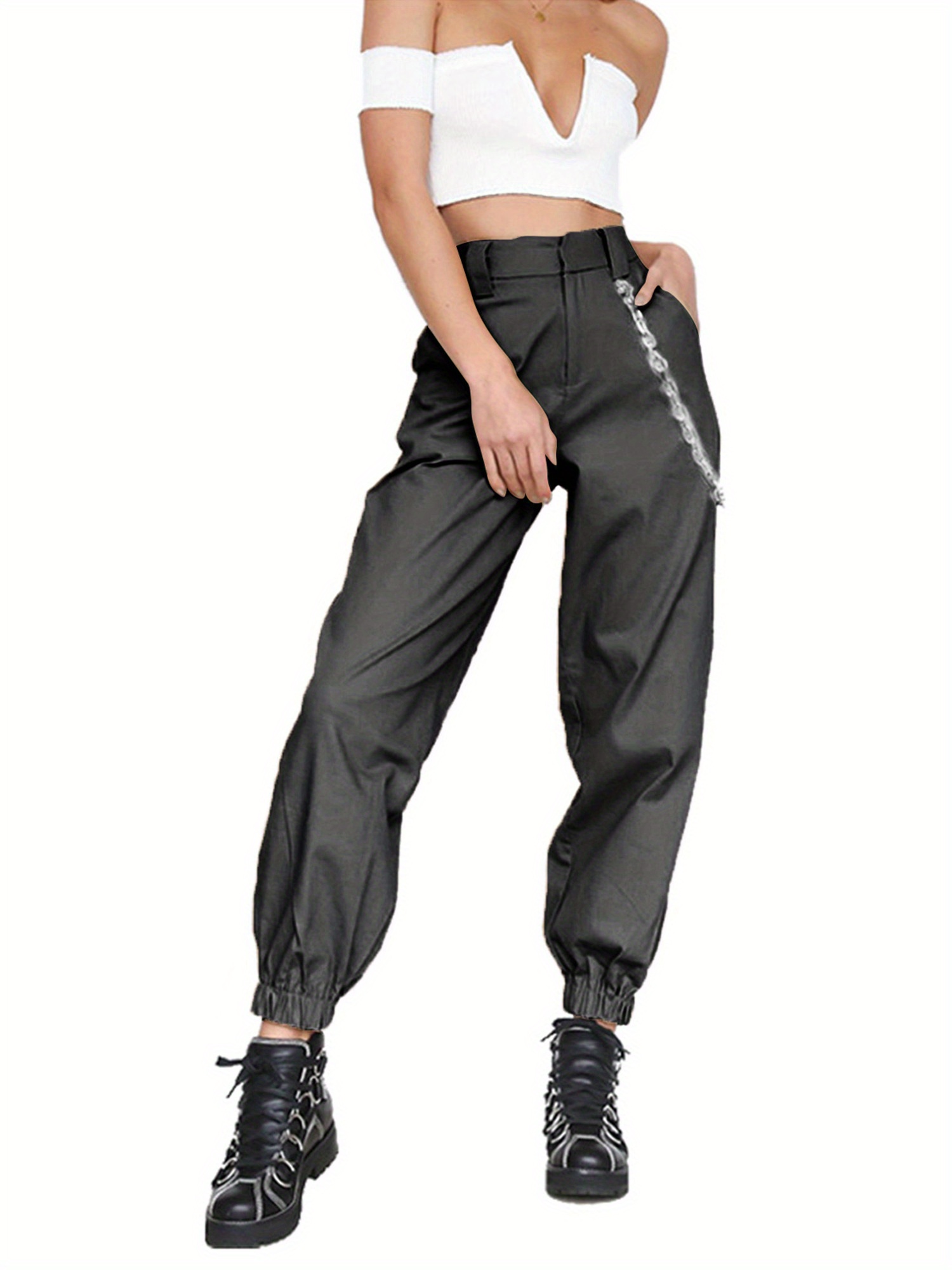 1pc Women'S High Waist Cargo Pants, Solid Color Casual Trousers with Chain Side Pockets, Elastic Ankle Joggers