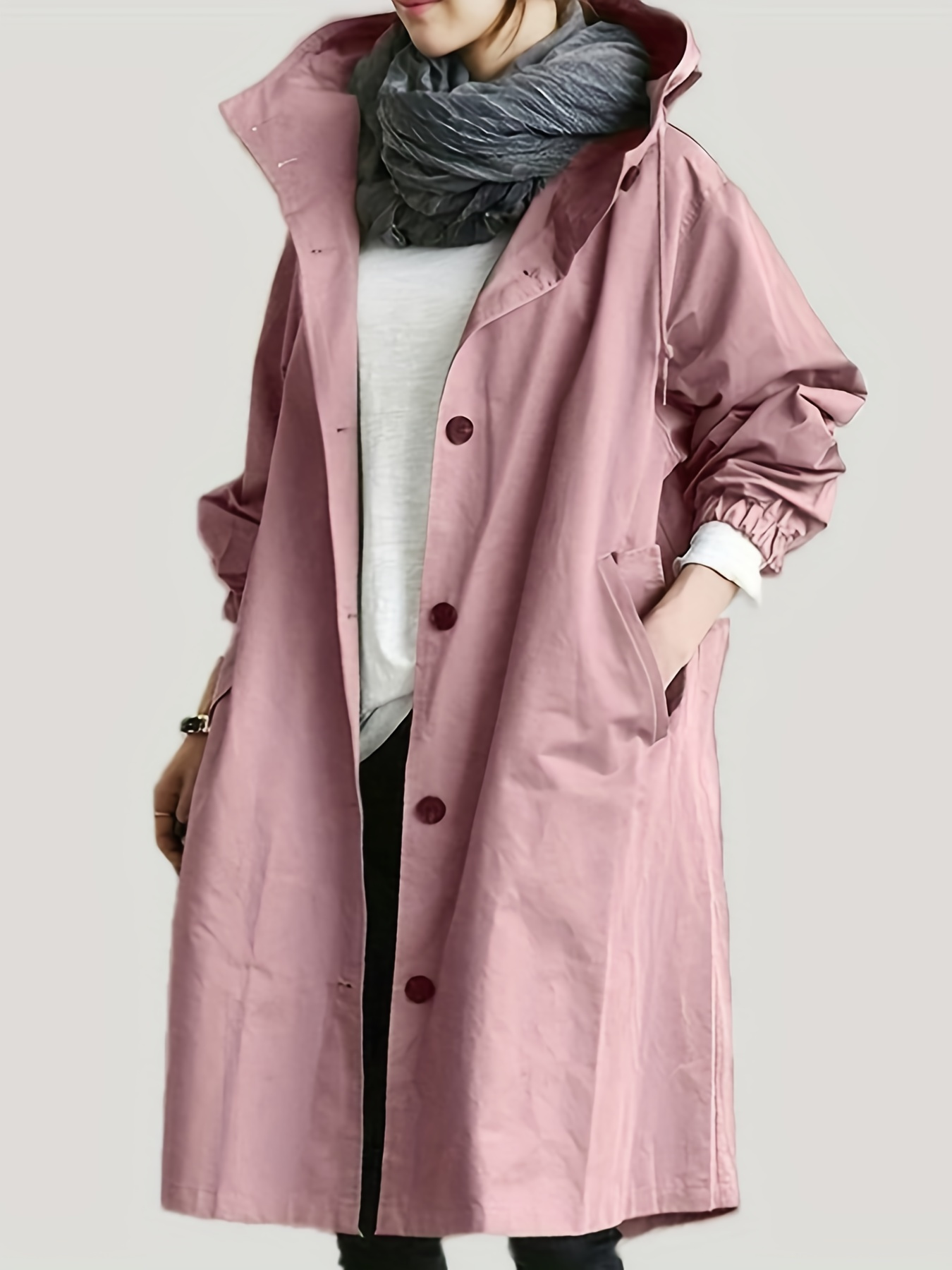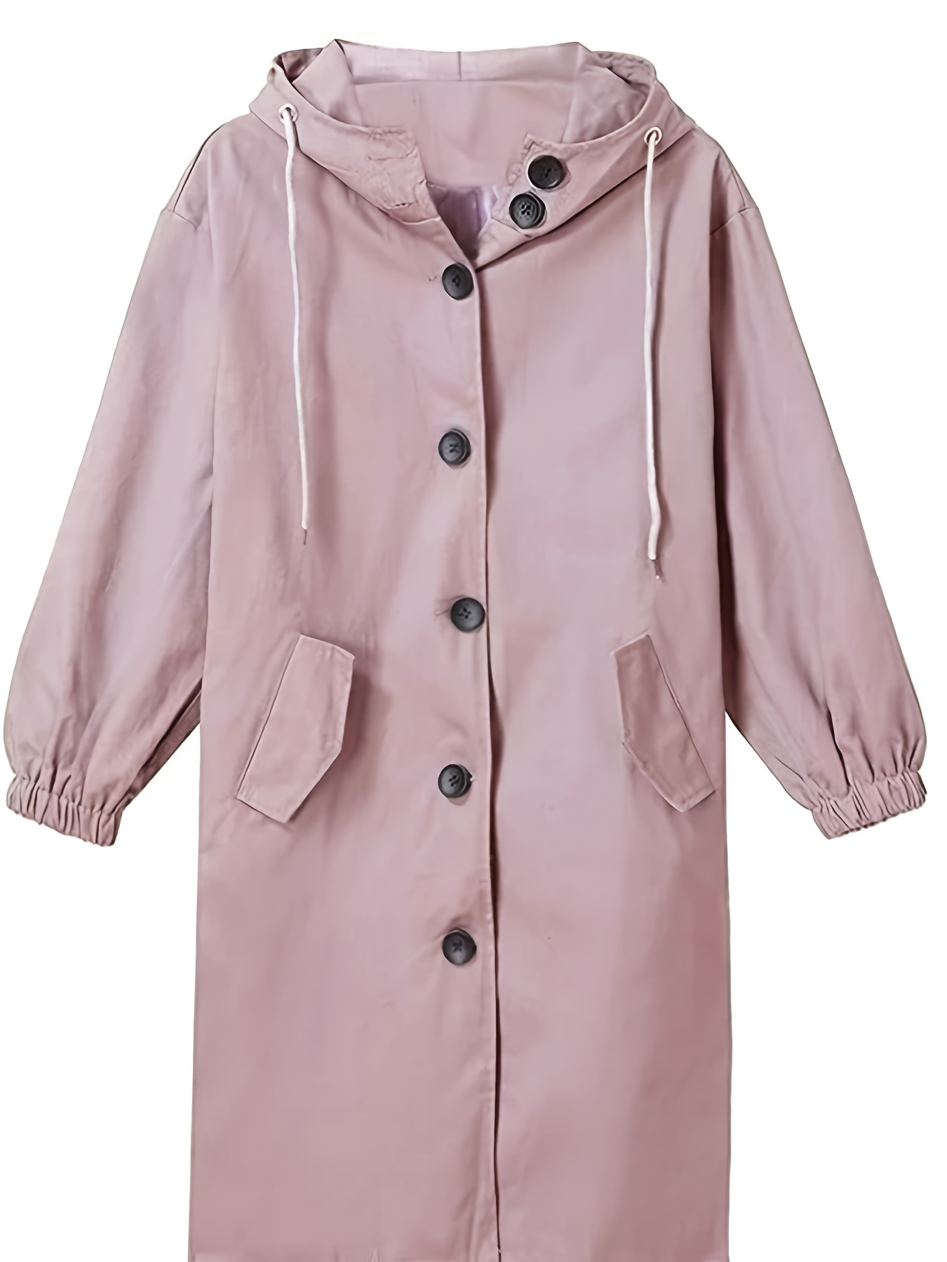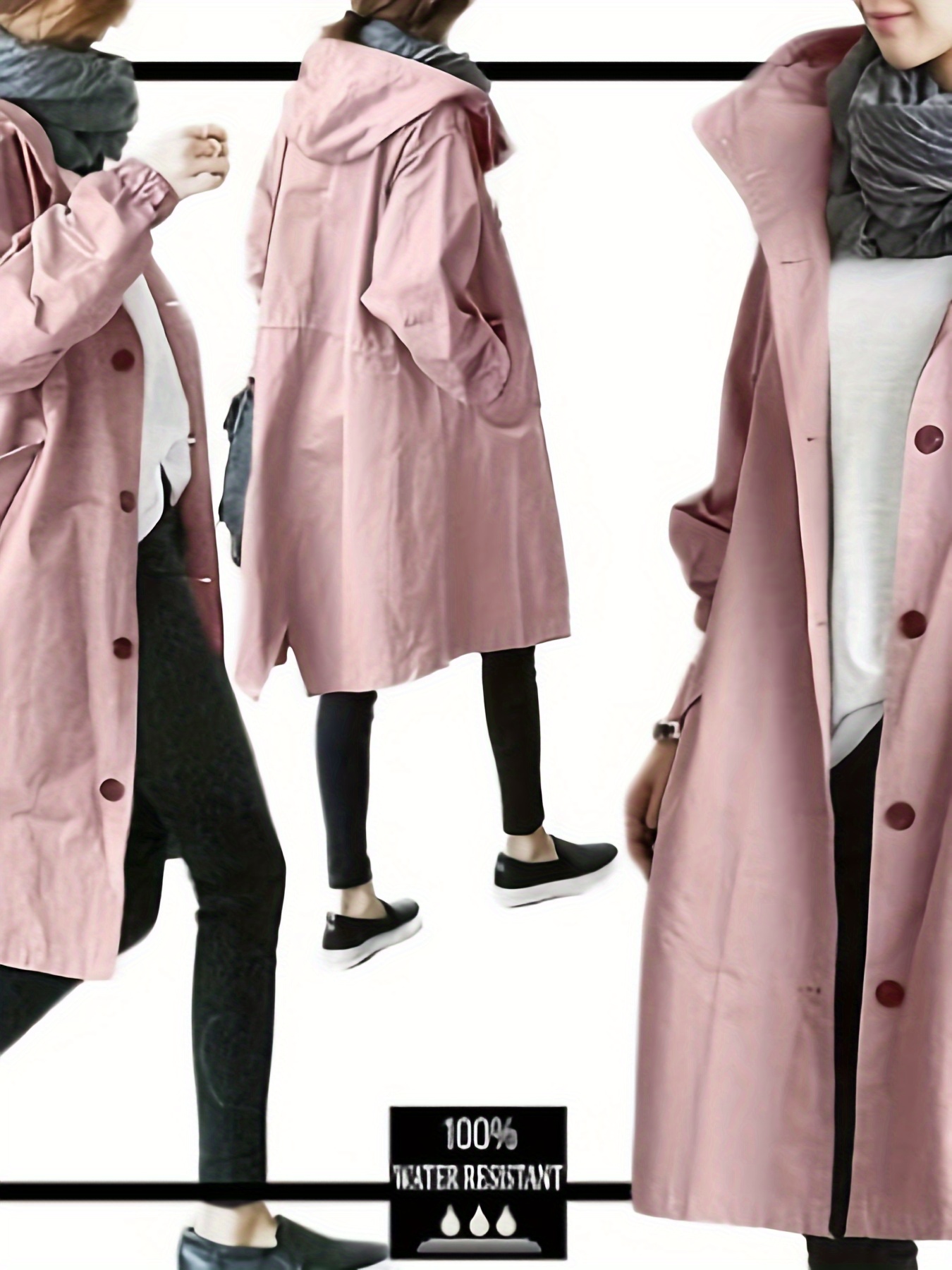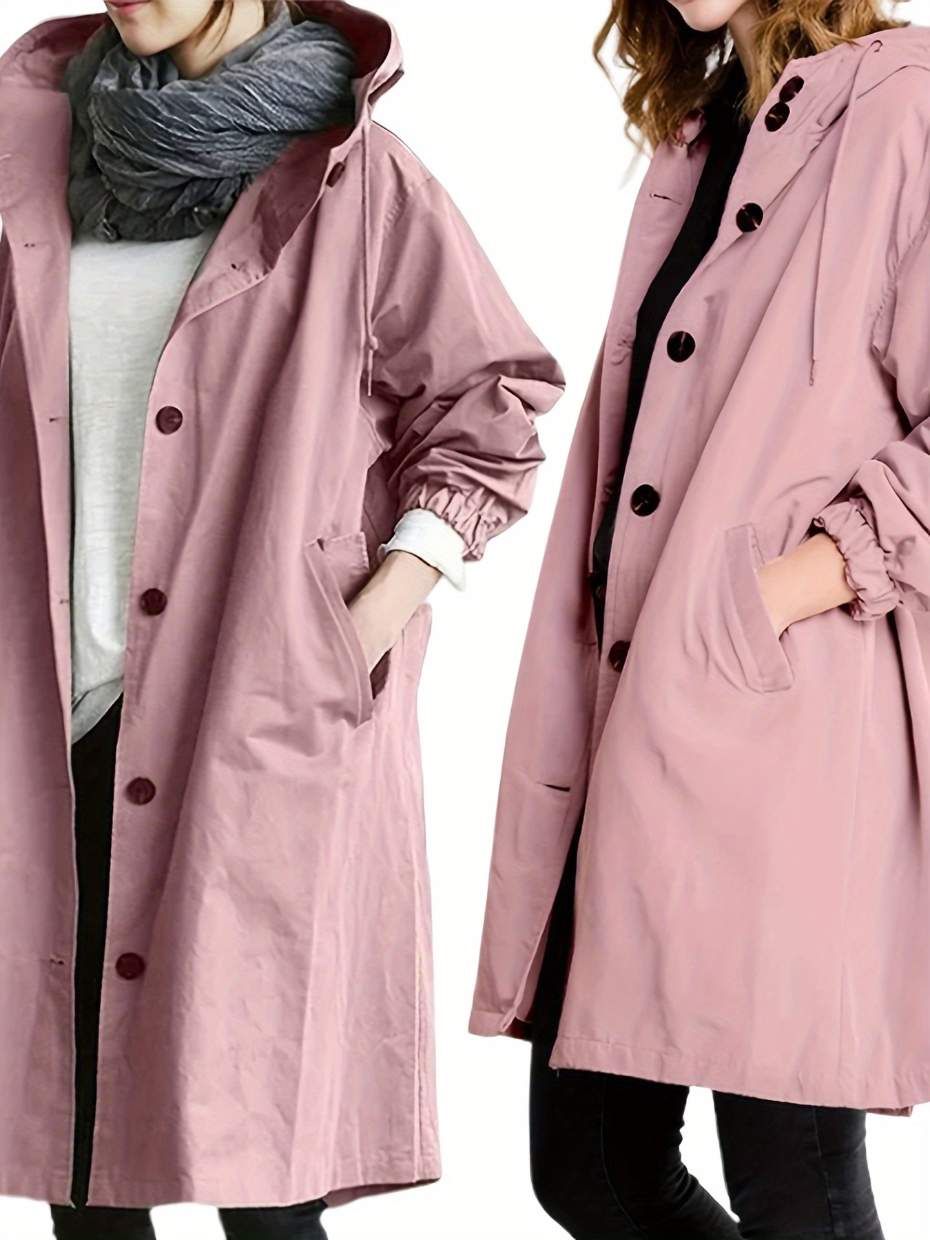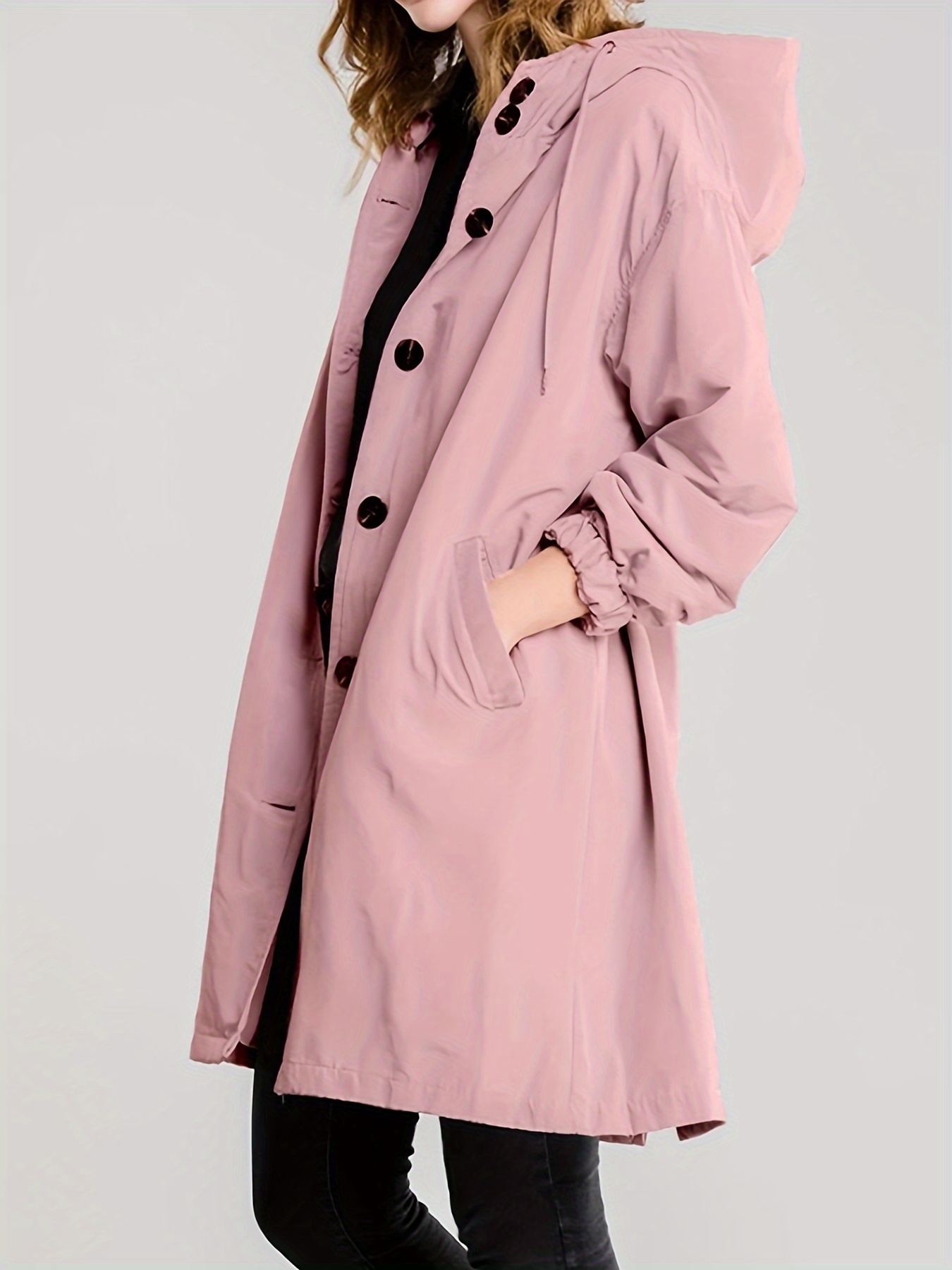 Casual Hooded Trench Coat for Women, Long Sleeve Polyester Blend Jacket with Button Closure, Slight Stretch Solid Color Coat with Pockets for Spring/Fall
