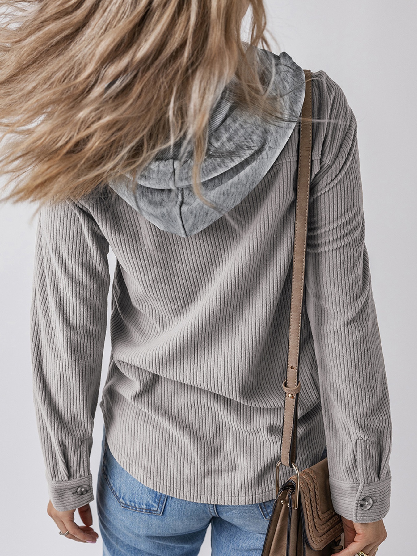 Plus Size Hooded Corduroy Shacket Jacket, Casual Polyester Blend Coat, Solid Color Block Design, Non-Stretch Fabric, with Drawstring, Button Down Vest for Spring/Fall