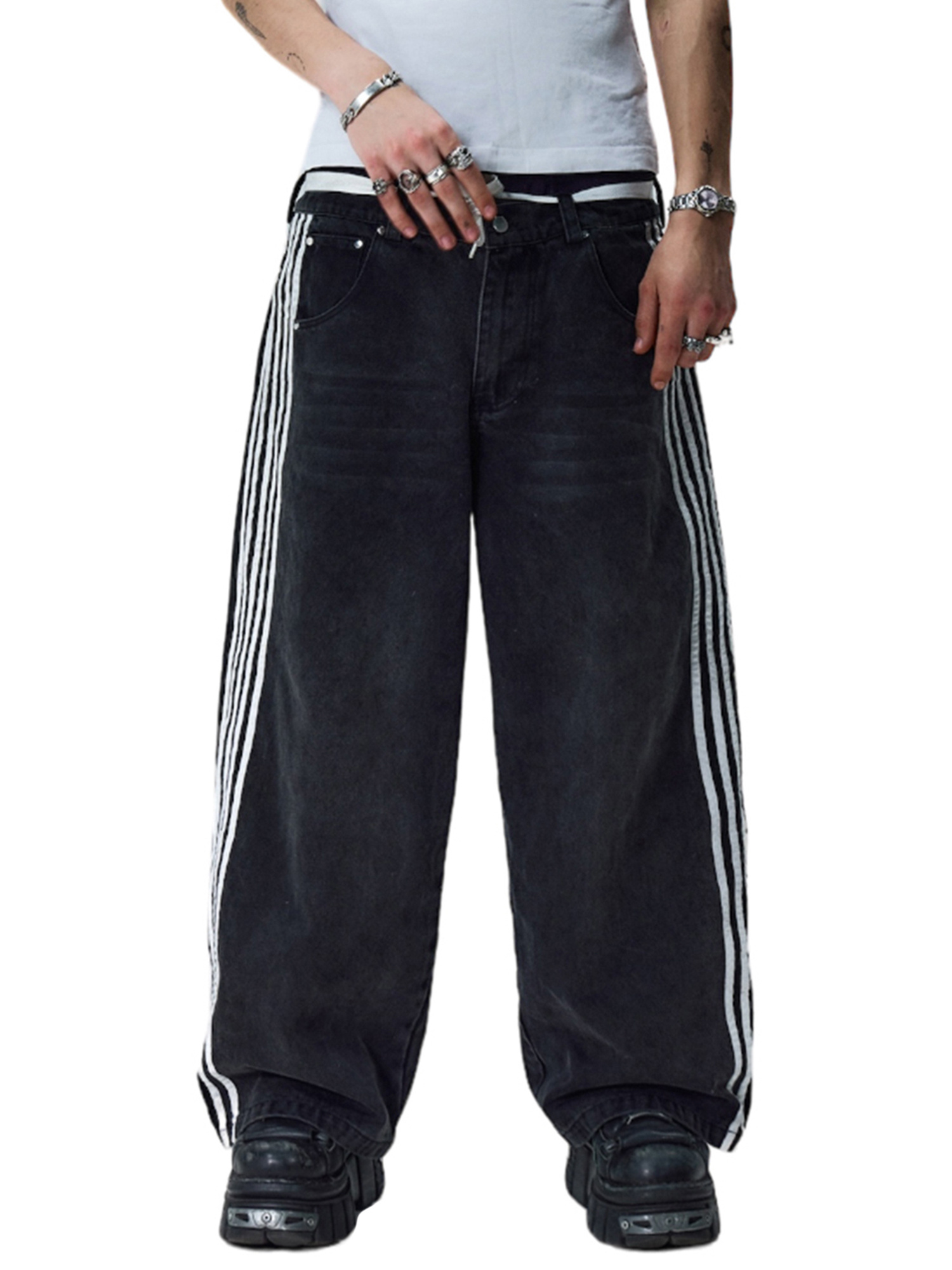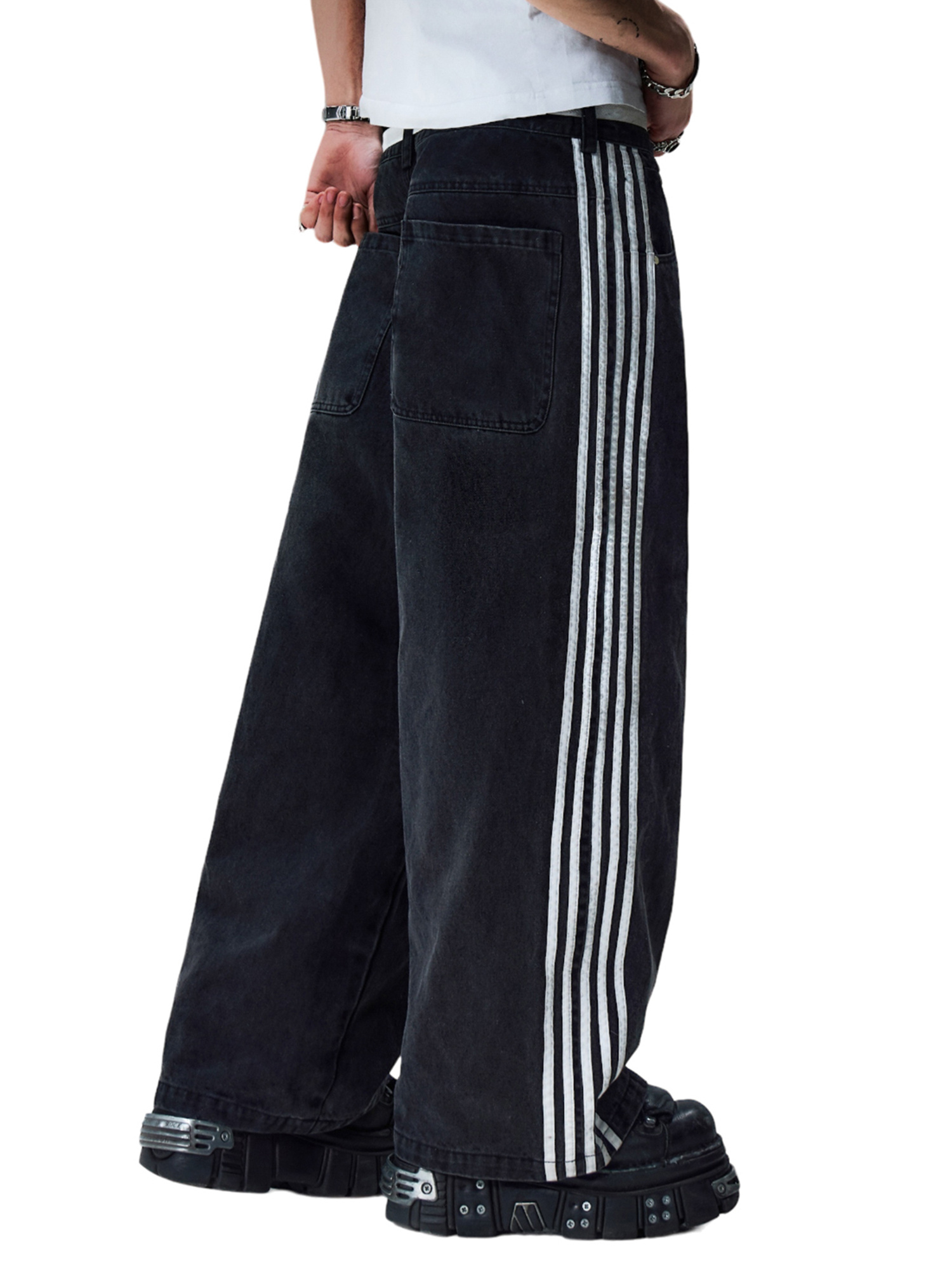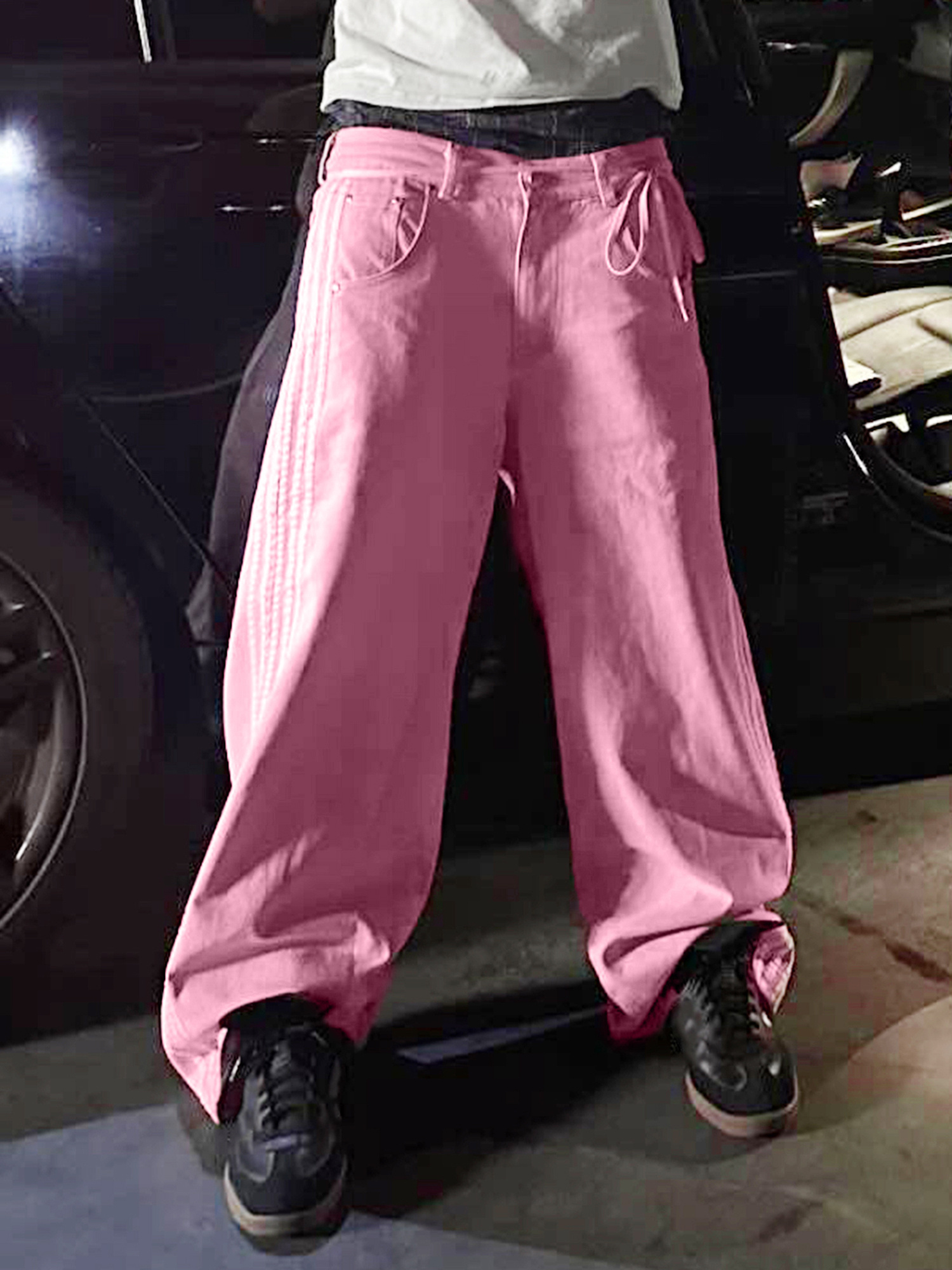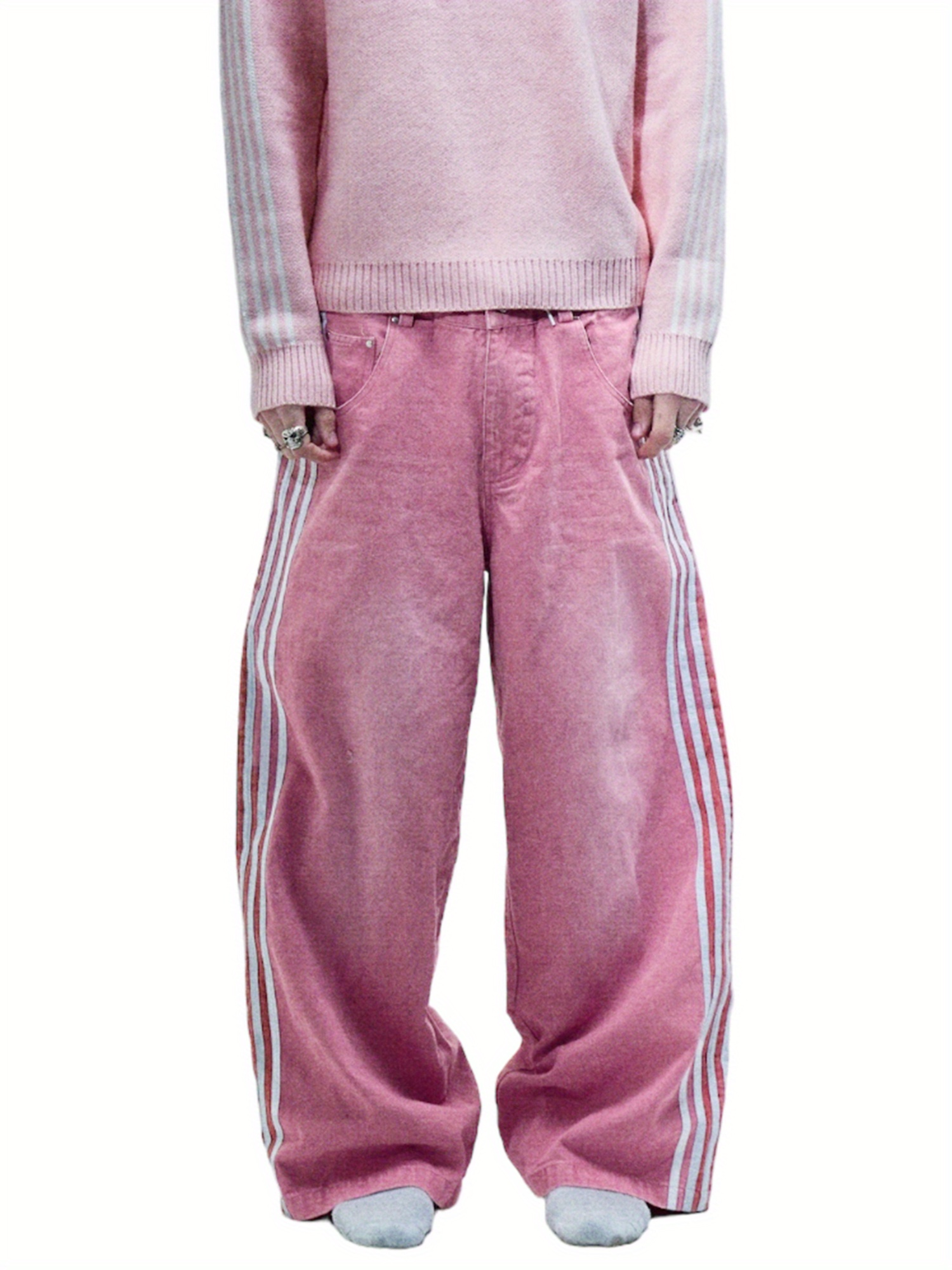 1pc Women'S Casual Wide Leg Faux Denim Pants with Striped Print, Cotton Loose Fit Trousers with Front Tie Bow Detail for Work Office Streetwear - All Seasons